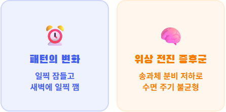 나이가 들면 뇌의 송과체에서 분비되는 수면 유도 호르몬인 멜라토닌의 양이 젊은 층의 절반 이하로 급감합니다. 이로 인해 잠드는 시간이 빨라지고 새벽에 일찍 깨는 '수면 위상 전진 증후군'이 나타나기도 합니다.