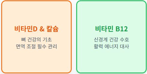 - 비타민 B12: 노화로 인해 위산 분비가 줄면 고기 속의 B12 흡수가 어려워집니다. 신경계 건강과 에너지 대사를 위해 별도 섭취가 권장됩니다.