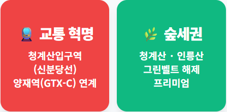 - 🚆 초강력 교통망: 신분당선 청계산입구역이 인접해 있으며, 인근 양재역(GTX-C 노선 예정)과의 연계로 강남 및 수도권 전역으로의 접근성이 극대화됩니다.