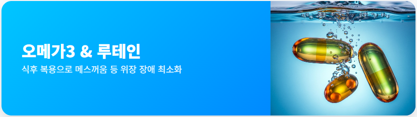 - 오메가3 & 루테인: 대표적인 지용성 성분으로 식후 복용 시 메스꺼움 등 위장 장애를 최소화할 수 있습니다.